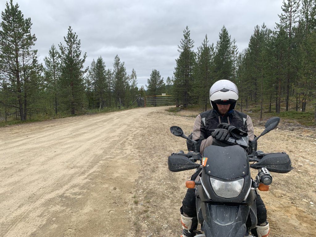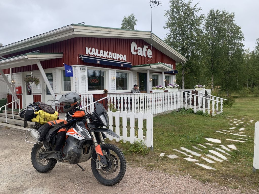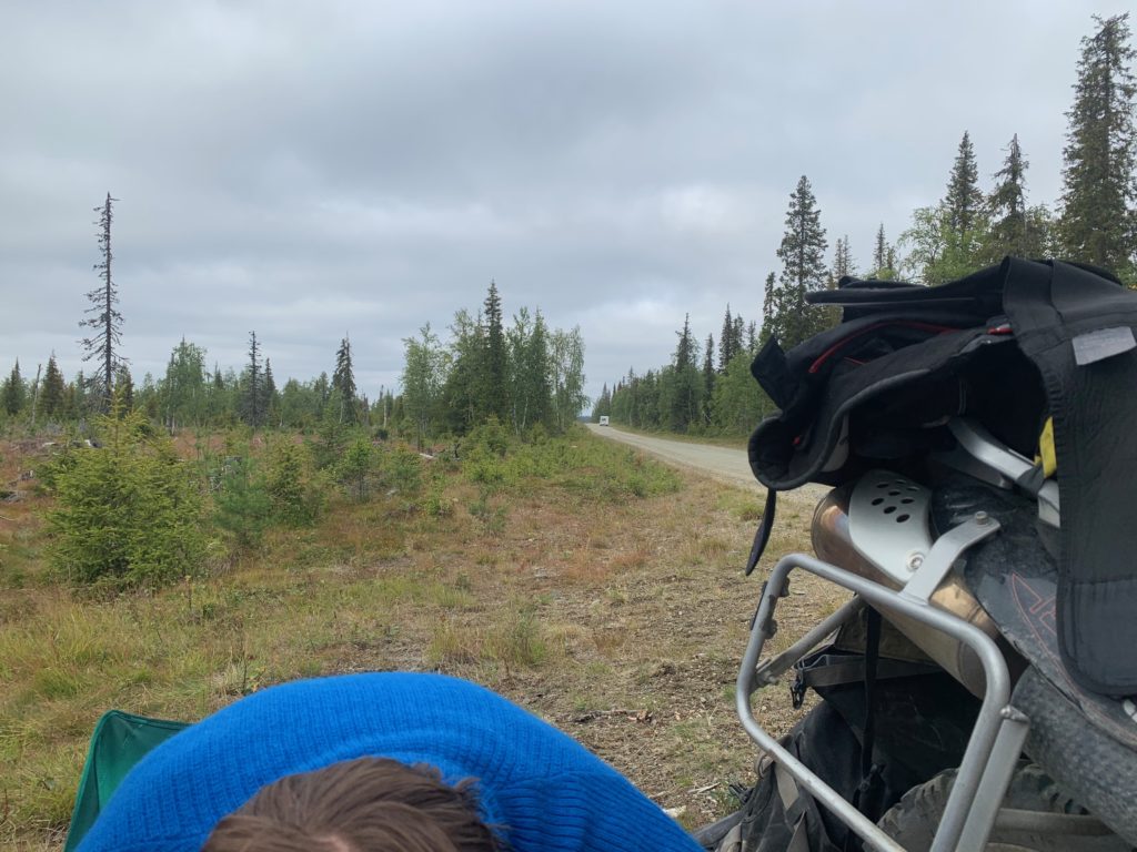 Today we had the longest stretch of our journey without gas stations or civilization really ahead of us. 290 km of endless forest gravel roads and a coffee break later we arrived at the gas station in Salla. Driving so far was very calm, temperatures fair and most of all no rain . We both listened to audio books and enjoyed this lap of our journey. Despite the remoteness, some cars were driving by as we made a stop.