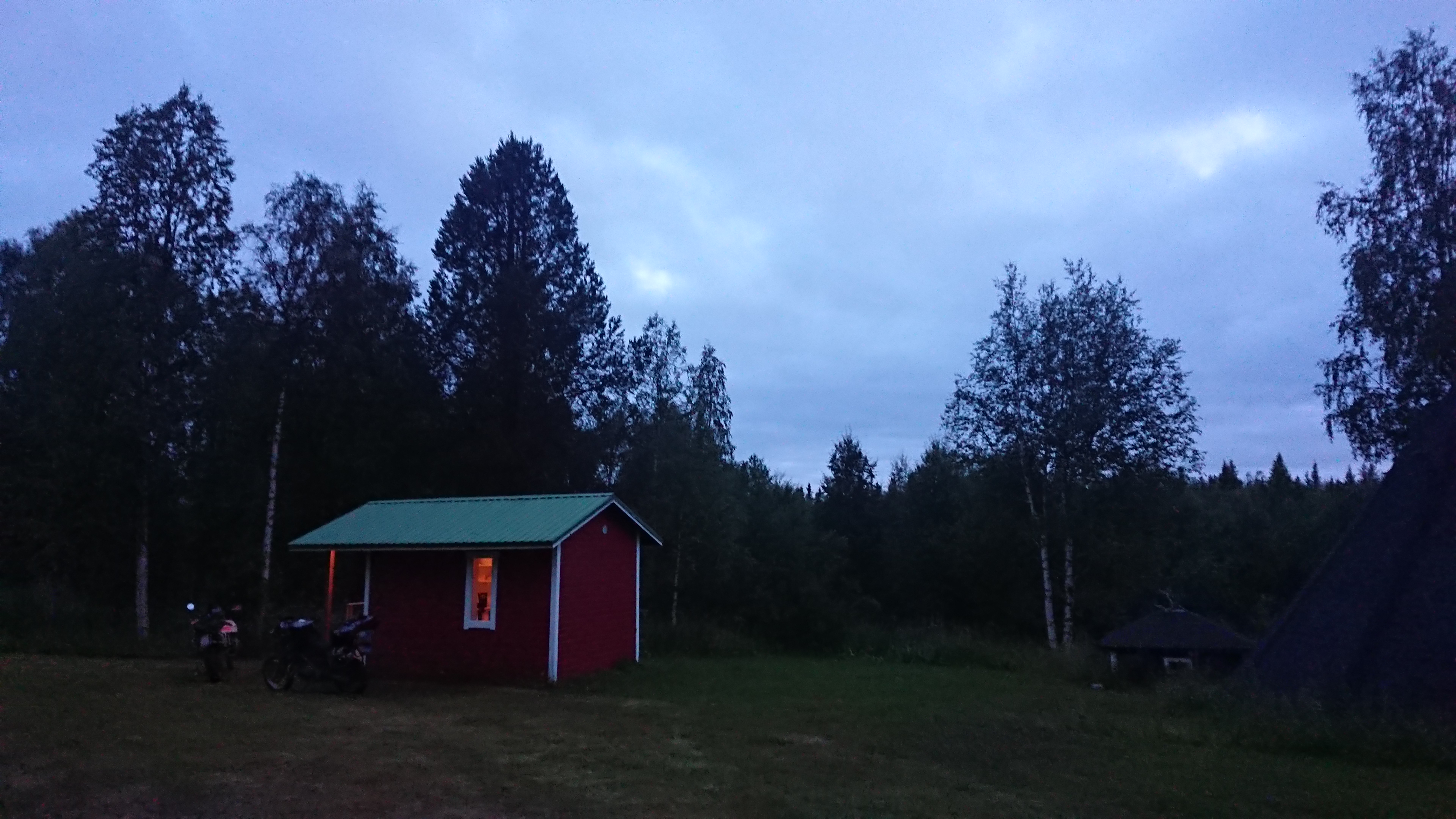 In Salla we got gas, I had reached my reserve about 60km before (avg. consumption was in my favor at 3.7 l /100km) ate some chocolate and brewed another coffee. We were looking forward to a toilet, but the shop of the gas station was closed. Apparently that was unusual, as several people tried to get in, and wondered about the locked door. A group of Finnish bikers, also driving adventure motorcycles but keeping to themselves (stereotypical?) had a break right next to us but left earlier. We shopped for some food and got extras on Fazer chocolate (recommendation of Camilla and the TET linemen). Tomorrow will be the first day without porridge as we bought some rye flatbread and some toppings instead. We left Salla and a found a camping spot 35 km down the road. An old leg of the main road, which ended at a small creek. The sun had started to shine and the landscape had a non intimidating calm beauty. Much less dramatic than Norway but still captivating. The camp spot was in soft sandy ground and my side stand wouldn’t work so I dug in my rear wheel. We cooked a soup inside of the tent to get away from the mosquitoes and booked our ferries later. We decided to leave finland on the 21st. That leaves some room for relaxation / problems to spare while still accomplishing the whole TET, assuming we will continue to progress like today.