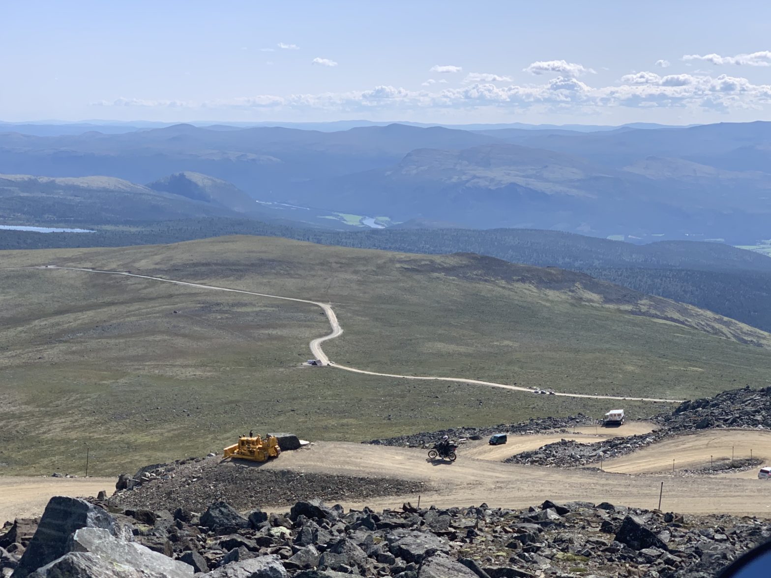 But this one turned out not to be difficult as it was shallow not fast flowing and almost devoid of any bigger rocks. The kind of stream you can cross with your RV. We followed the road some more and finally ended up taking the road up to Trofjell. It was steep and had some washboards every now and then but not difficult in our dry conditions. Benni joked about being able to get this one up on his street motorcycle with almost treadless tires. The steepest section was covered in tarmac, as all of the rest was gravel. But we already rode muddy single tracks in forest with some stones and grass, which were more steep. Although some vehicles did park before the steepest and last section and the people were walking the last meters.
