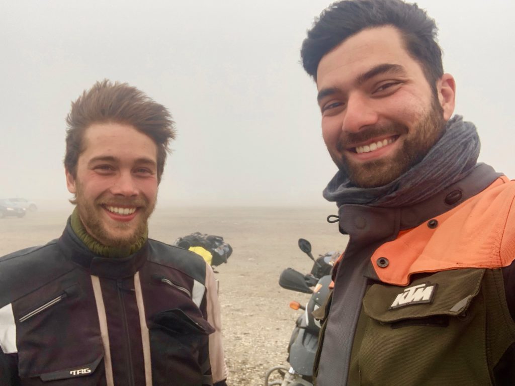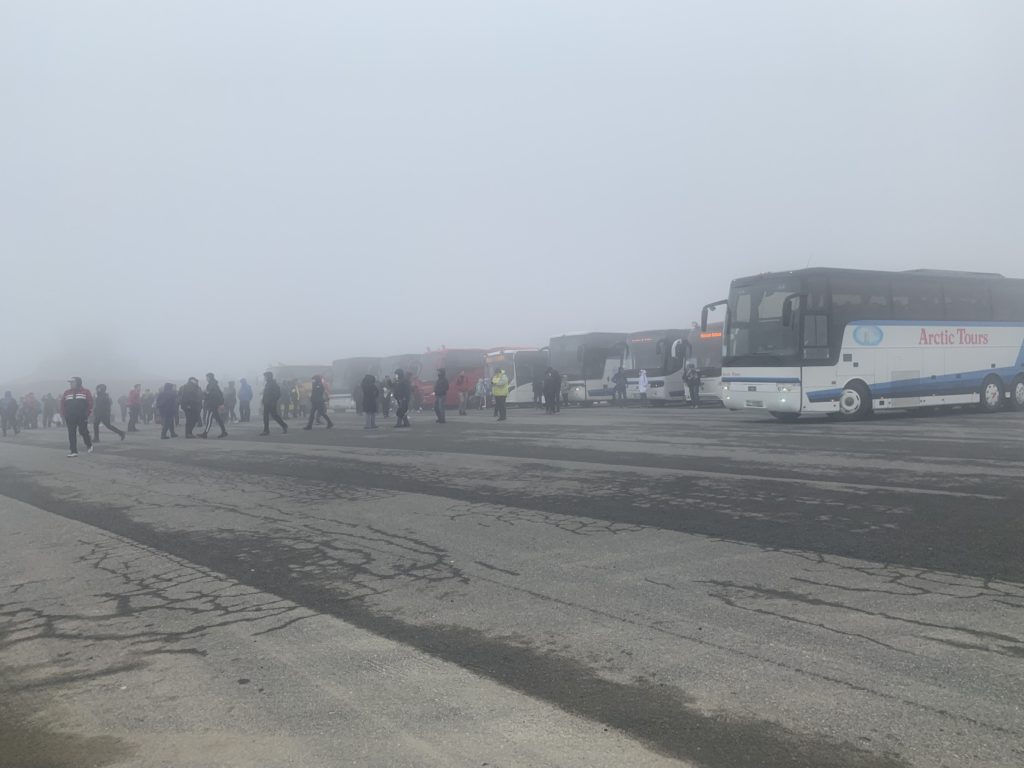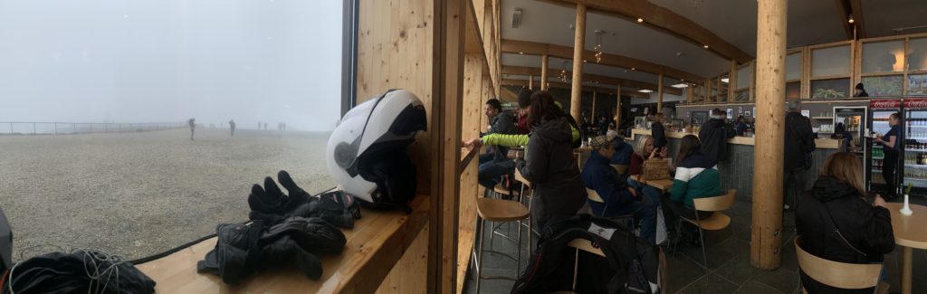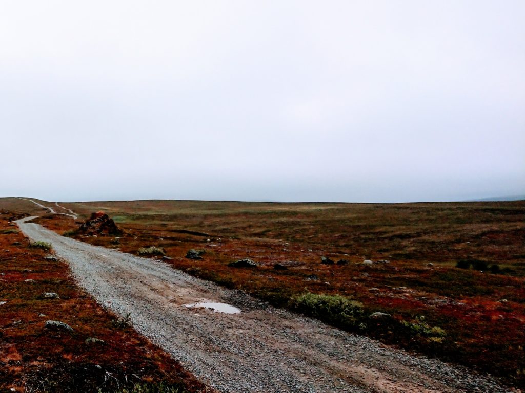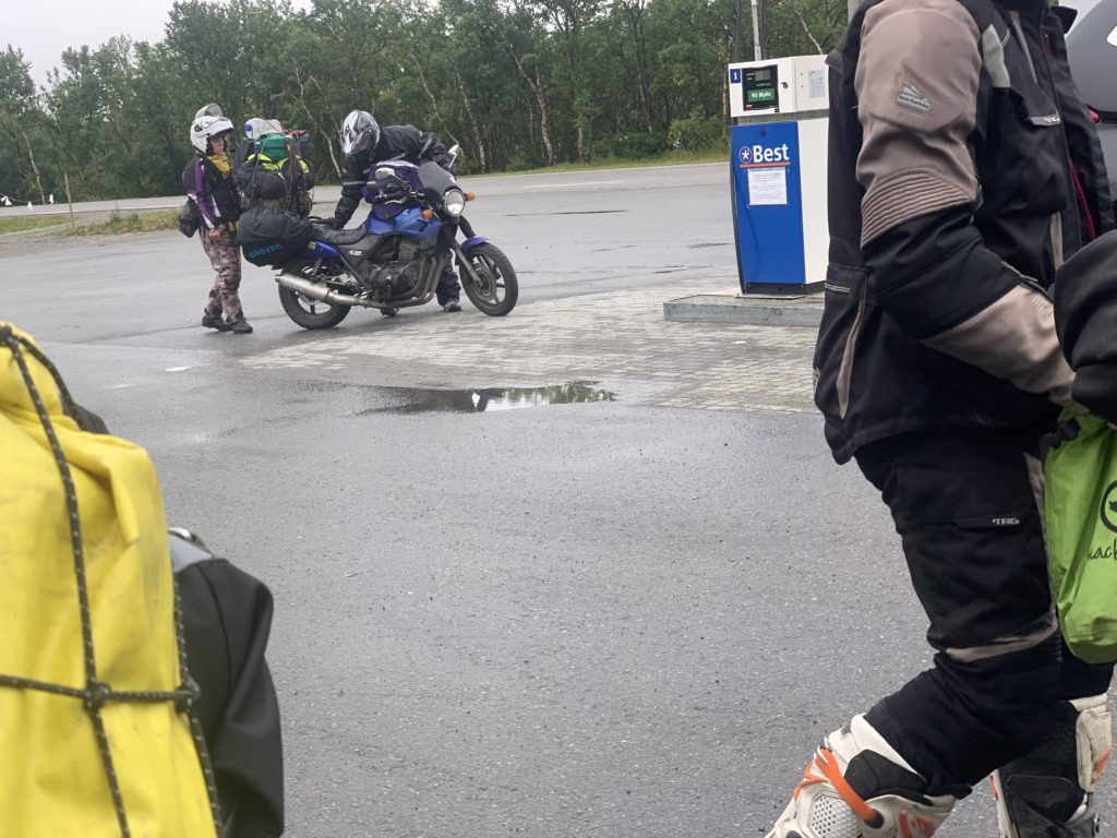Just before finally heading out into the cold and wet, we saw reindeer browse between the huts of the campsite. We got going, adamant to do the full extent of the TET as there was one part with a nice viewing point we did not want to miss out on. We left tarmac and rode a couple hundred meters of muddy back road and got to an dead-end in front of a river. To the right we just missed an even muddier trail. As the .gpx track was not very clear about it (we were not on roads according to our navigation systems) but still indicated we had to cross the river. It was cold and we no bridge in sight for this much faster wider and deeper river. So we turned around and took the tarmac road back. With dry feet I was a lot less cold and did not shiver. We continued and hit the reserve part of our tanks. No gas station in sight. After another 30 km of hoping and wishing and not really enjoying the view as much as on our way fro (it was misty this time) we reached a gas station. We filled up all the way and headed into the supermarket belonging to it. It was pricey. We got salt and had lunch in the warmth. Another German motorcyclist talked us up and we chatted for a bit. On our way out we saw a couple push starting a hopelessly overloaded old honda street bike. They got it going and while the driver played with the gas to keep it from dying (maybe the idle did not work?) she climbed the tower and they drove away.
